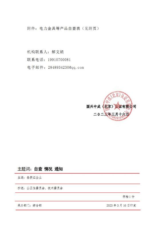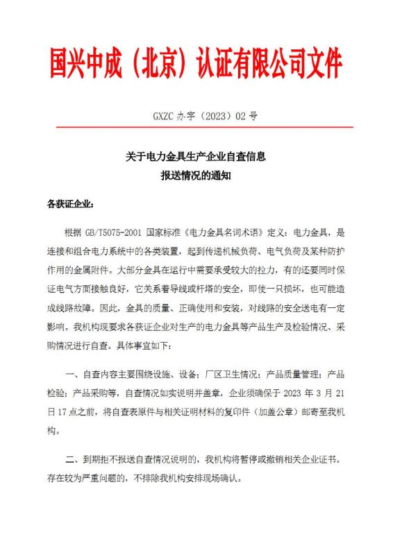 關(guān)于電力金具生產(chǎn)企業(yè)自查信息報(bào)送情況的通知